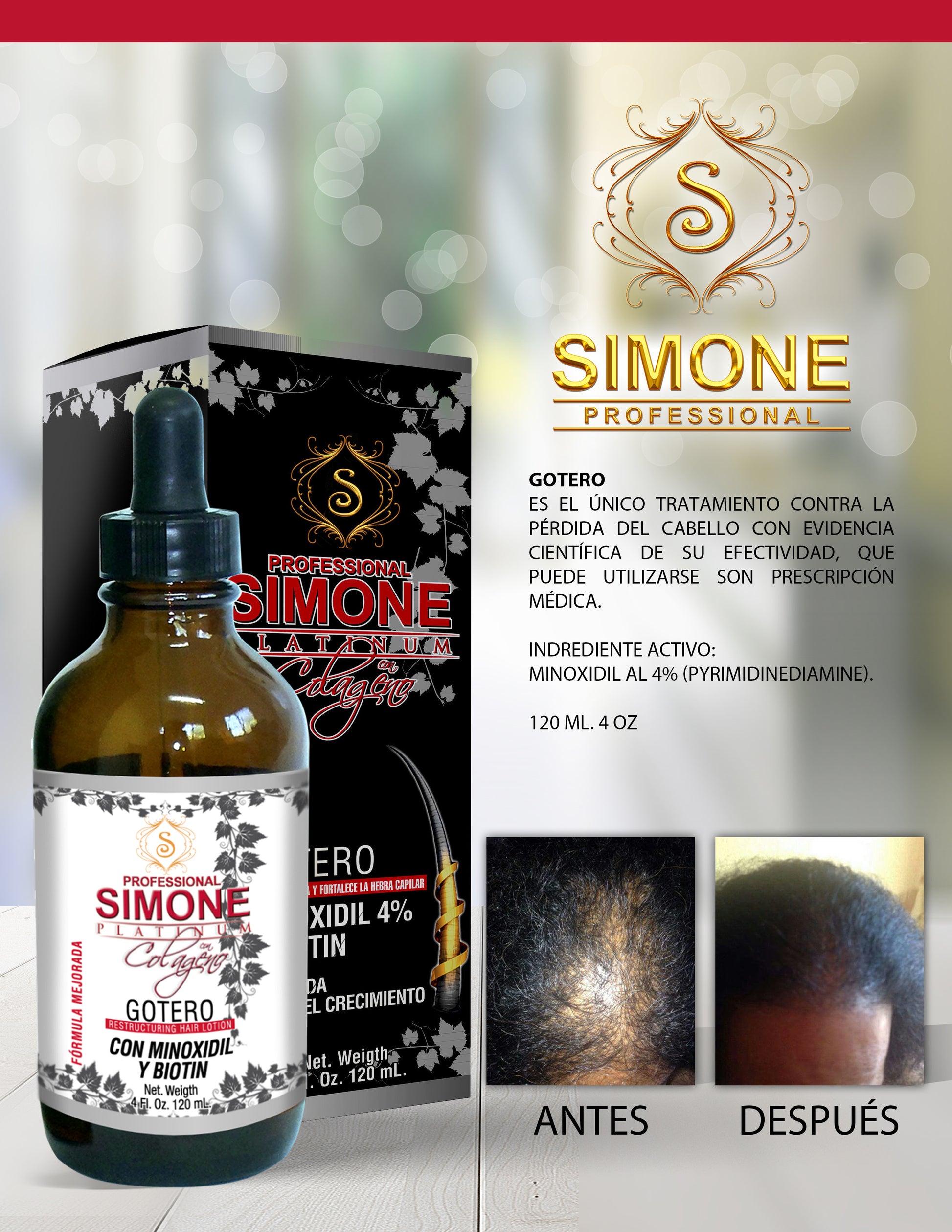 El Gotero Anti Caída Simone Colágeno 4oz es una loción reestructurante con Minoxidil al 4% y Biotina, que frena la caída, rellena las áreas debilitadas y acelera el crecimiento capilar.