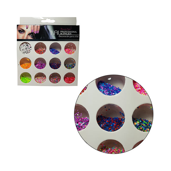 Variedad de diseños, piedras, glitter o bisutería para uñas. EL paquete contiene 12 jaras surtidas de diferentes colores o estilo de diseños para uñas.