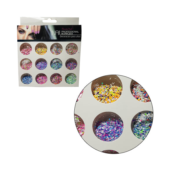 Variedad de diseños, piedras, glitter o bisutería para uñas. EL paquete contiene 12 jaras surtidas de diferentes colores o estilo de diseños para uñas.