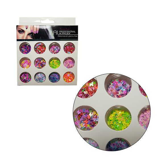 Variedad de diseños, piedras, glitter o bisutería para uñas. EL paquete contiene 12 jaras surtidas de diferentes colores o estilo de diseños para uñas.