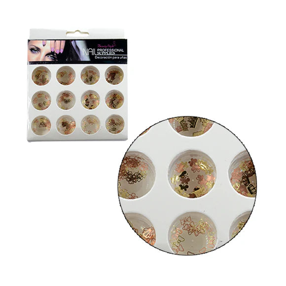 Variedad de diseños, piedras, glitter o bisutería para uñas. EL paquete contiene 12 jaras surtidas de diferentes colores o estilo de diseños para uñas.