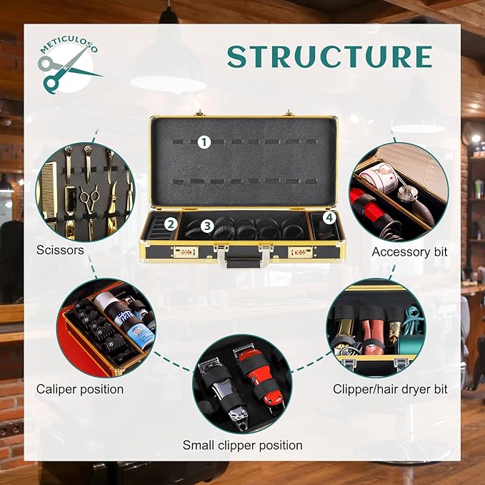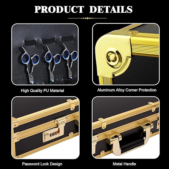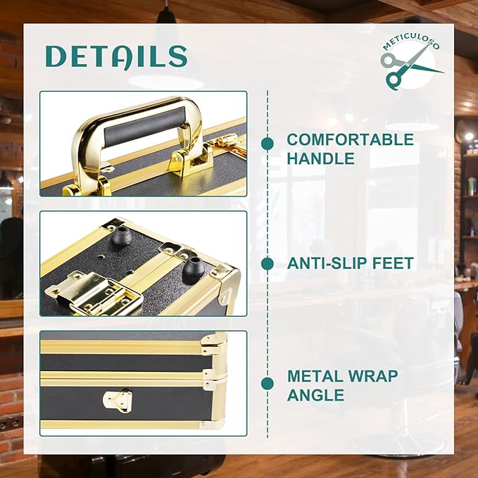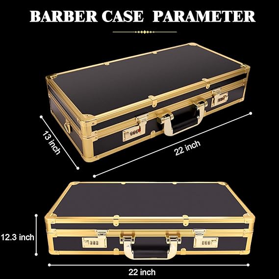 Alta calidad: la caja de peluquero adopta una superficie y estructura de aluminio de alta calidad. Tiene esquinas reforzadas para mayor durabilidad. El clásico acabado negro es hermoso y suave.