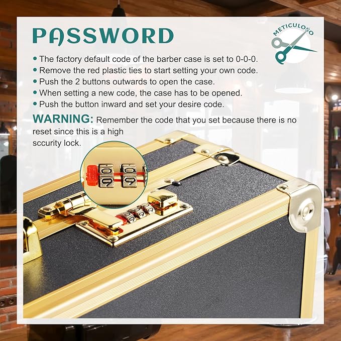Diseño de bloqueo de código de seguridad: el maletín de barbero está equipado con un bloqueo de código de seguridad, el código predeterminado es 000, puedes personalizar tu bloqueo de código de seguridad y proteger tus herramientas.