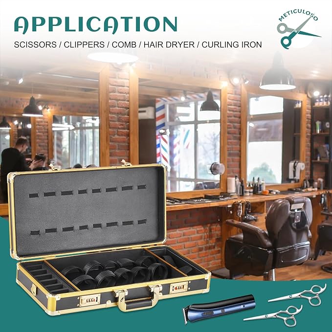 Tamaño de almacenamiento perfecto: la caja de herramientas de peluquería profesional es perfecta para todas tus herramientas profesionales. Las dimensiones de almacenamiento de tijeras son 14.75 x 11 x 2.5 pulgadas; las dimensiones totales de la carcasa son 21 x 12.75 x 4.25 pulgadas.