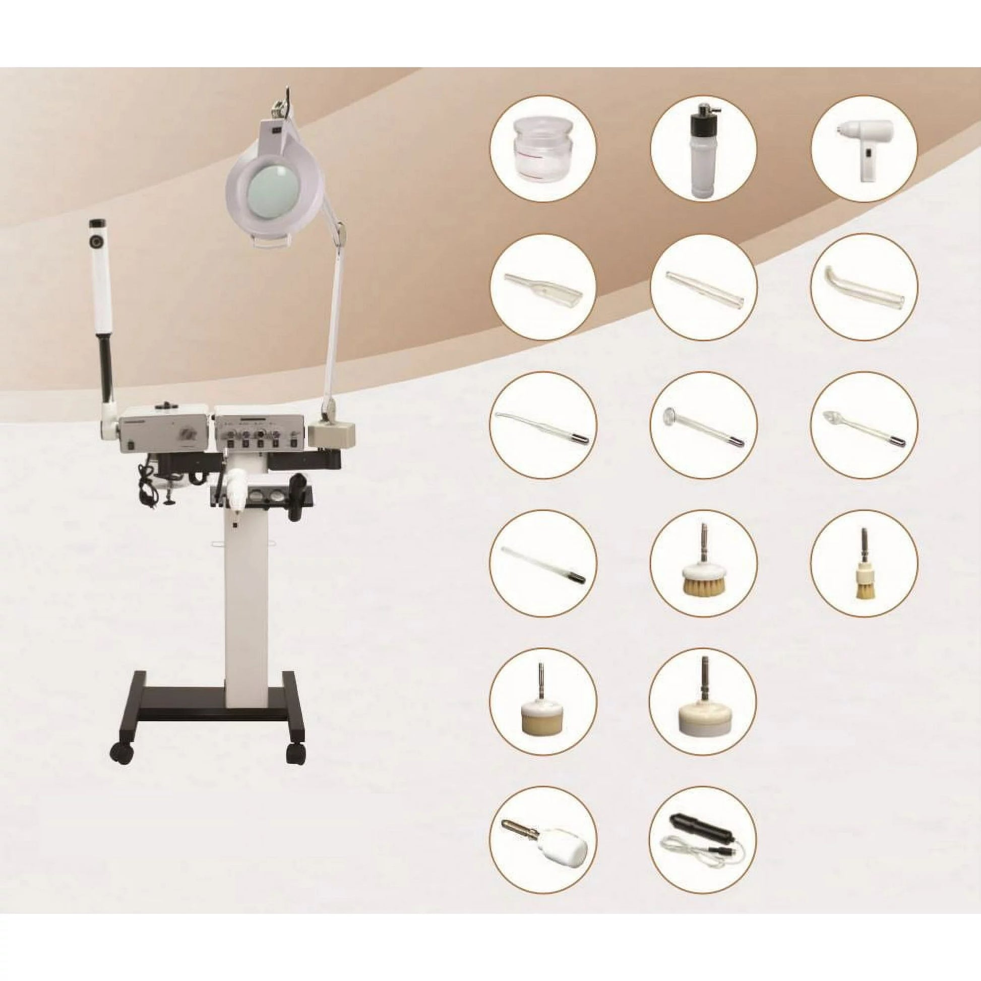 This 8-in-1 Facial Machine is a complete unit that is capable of delivering 8 common spa services without the need for addition equipment. The 8-in-1 design saves several hundred dollars compared to buying separate pieces to achieve all of the functions of this single unit. The multi-function machine also saves space since everything is located on a single rolling platform. The built-in casters allow the machine to easily be moved from one room to another as needed.