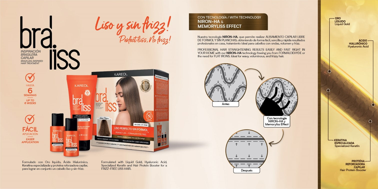 El Pack Alisado Braliss de Kareol, está formulado con oro líquido, ácido hialurónico, keratina especializada y proteína reforzada capilar, para lograr en conjunto un cabello liso y sin-frizz.