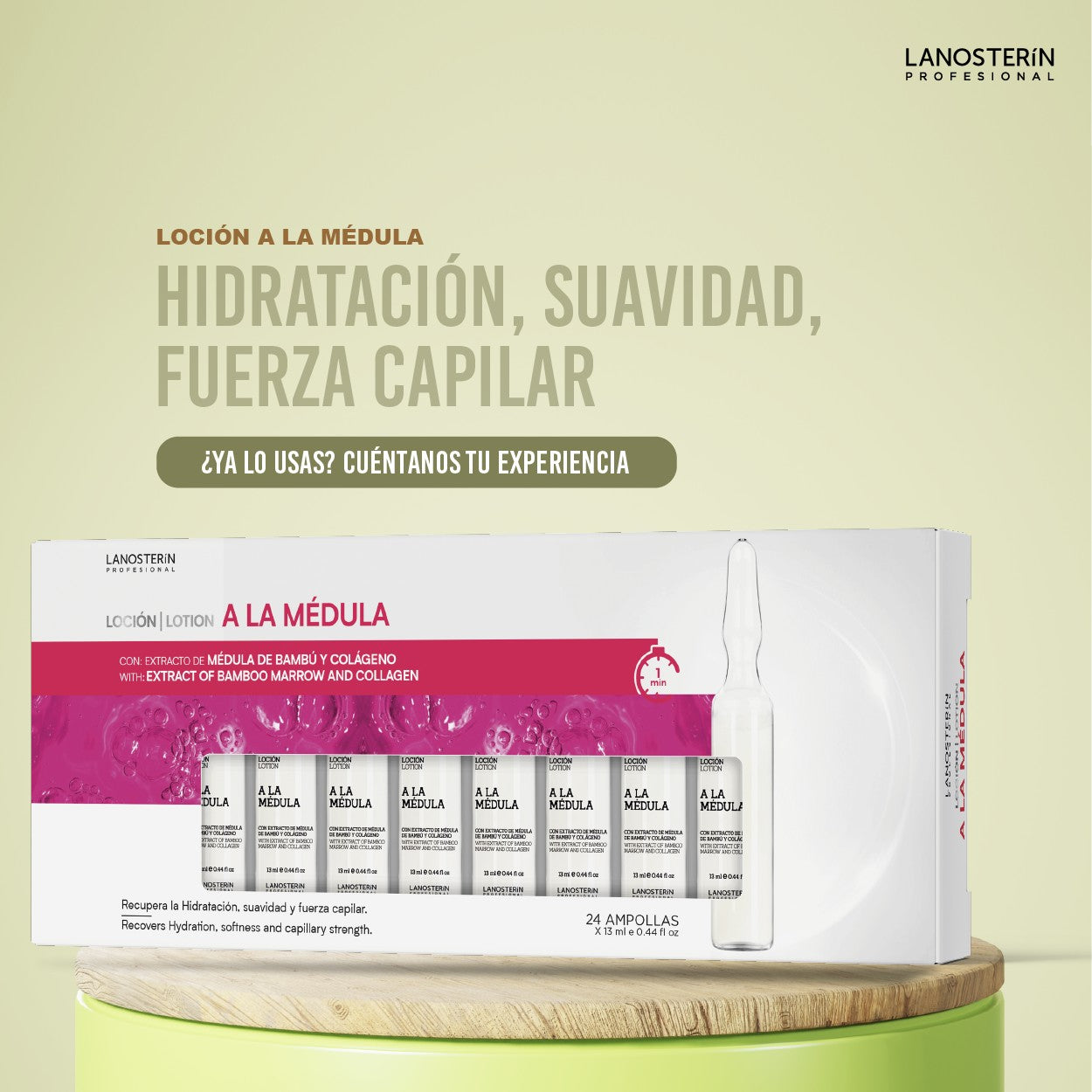 Loción a la médula de Lanosterín posee una alta concentración de aceites y proteínas que restablece el equilibrio fisiológico del cabello reforzando los componentes propios de la estructura de la fibra capilar. El colágeno forma una película protectora en el cabello que promueve la hidratación y humectación de la fibra capilar y del cuero cabelludo devolviendo la resistencia, solidez y flexibilidad propias de un cabello sano.