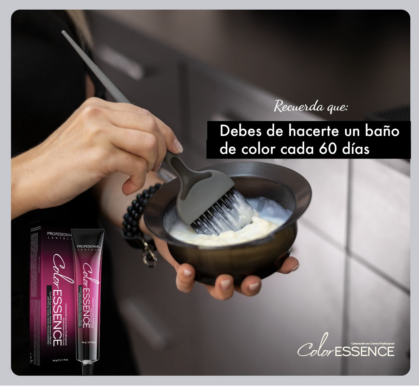 Aplicación del tinte Color Essence: En un recipiente no metálico, mezclar el contenido de 1 tubo de Color Essence de 60g con 90ml de Oxidante en crema Orlox. Proporción de la mezcla 1+1 ½. Aplicar la mezcla en medios y puntas de 20 a 25 minutos. Volver a preparar la mezcla y aplicar en las raíces de 15 a 20 minutos más.