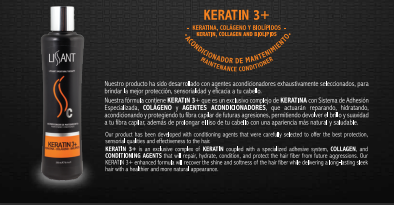 Desarrollado con agentes acondicionadores exhaustivamente seleccionados, para brindar la mejor protección, sensorialidad y eficacia a tu cabello. Nuestra KERATIN 3+ es una exclusiva asociación de KERATINA con Sistema de Adhesion Especializada, COLAGENO y AEGENTES ACONDICIONADORES, que actuaran reparando, hidratando, acondicionando y protegiendo tu cabello para lograr devolverle brillo, suavidad y prolongar el alisado.