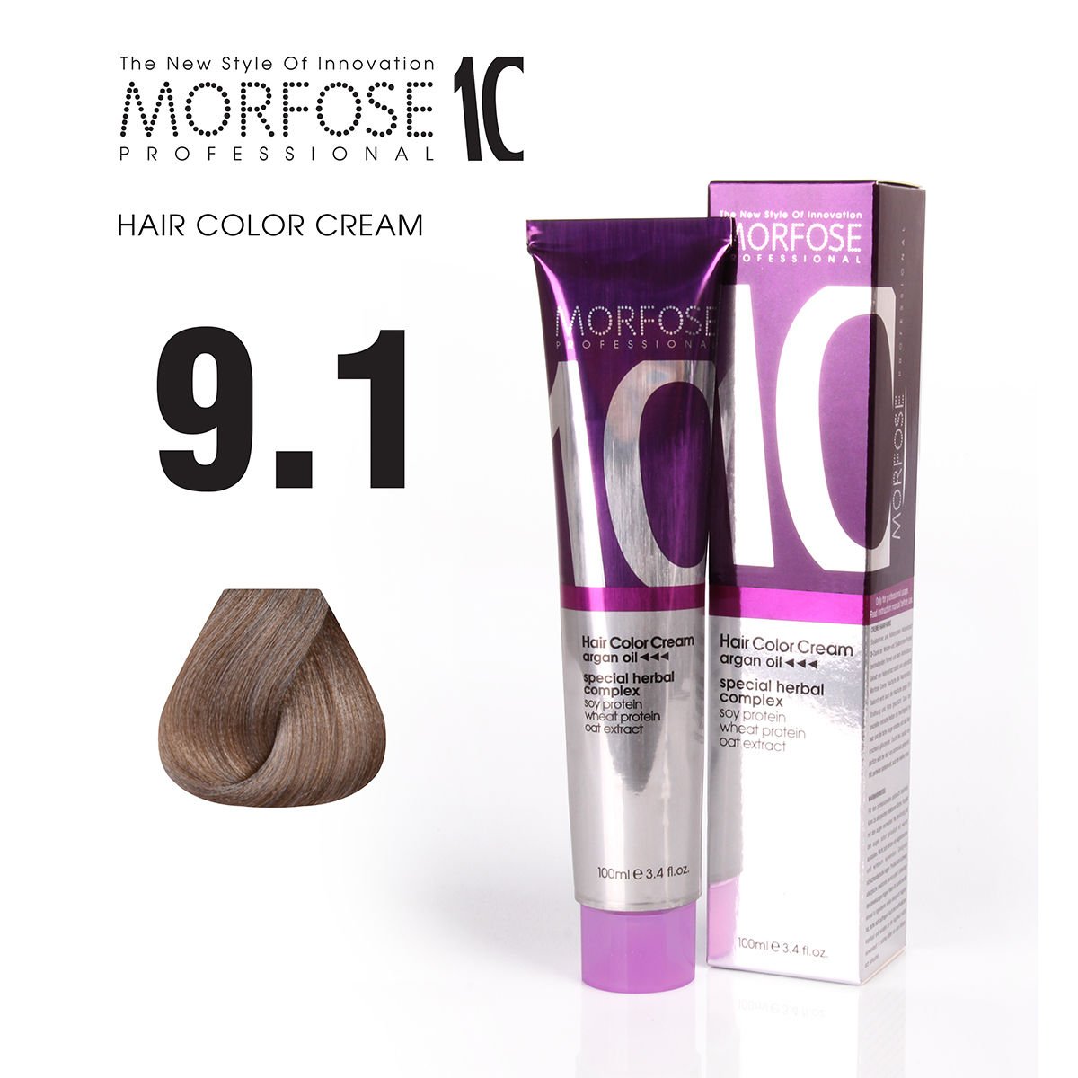 Tinte Profesional Morfose 10 - Rubio Ceniza Claro 9.1 con Aceite de Argán y Multinutrientes (Sin Amoníaco)