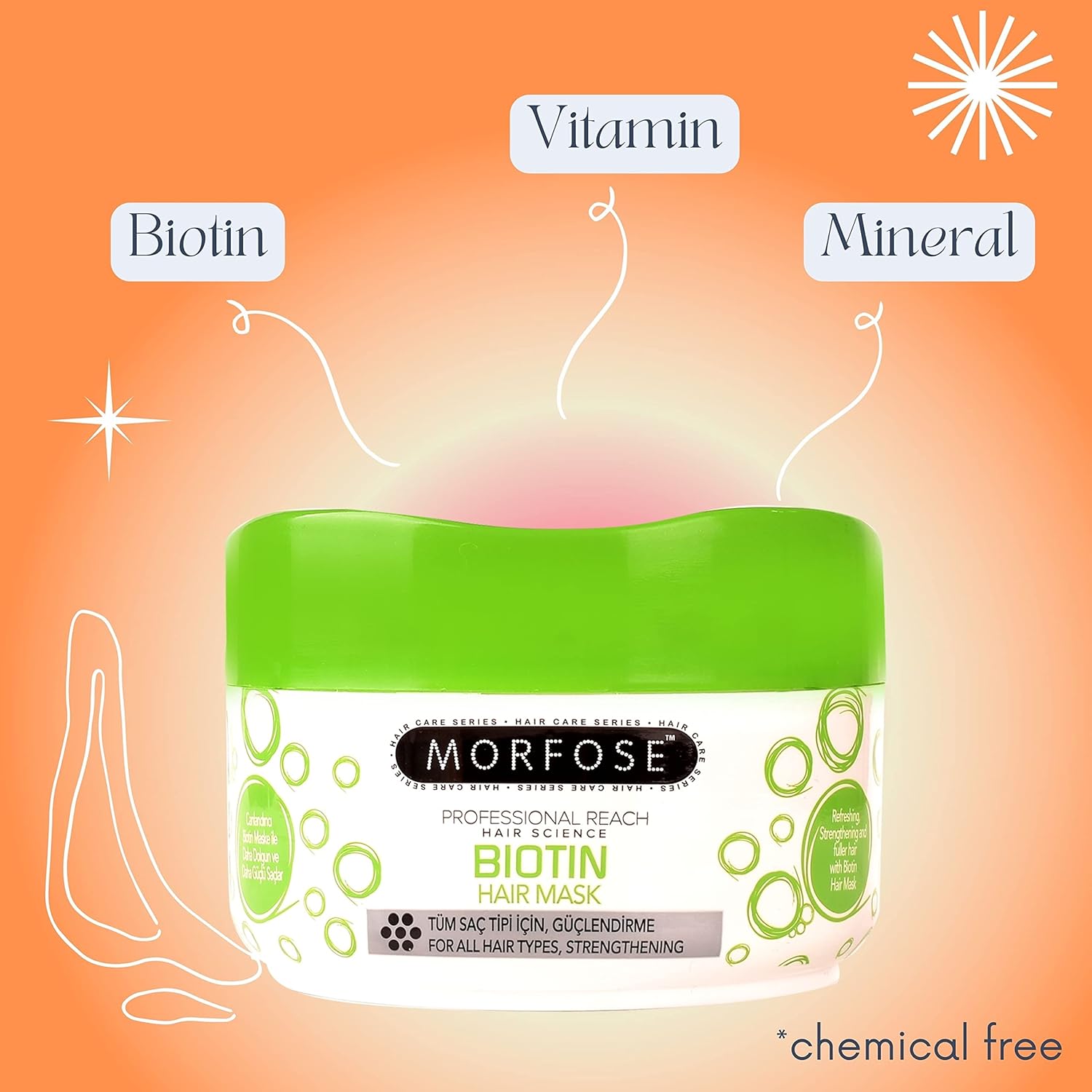 Impulsa la fuerza y vitalidad de tu cabello con la Morfose Biotin Hair Mask, enriquecida con biotina, queratina, vitaminas y aminoácidos esenciales.
