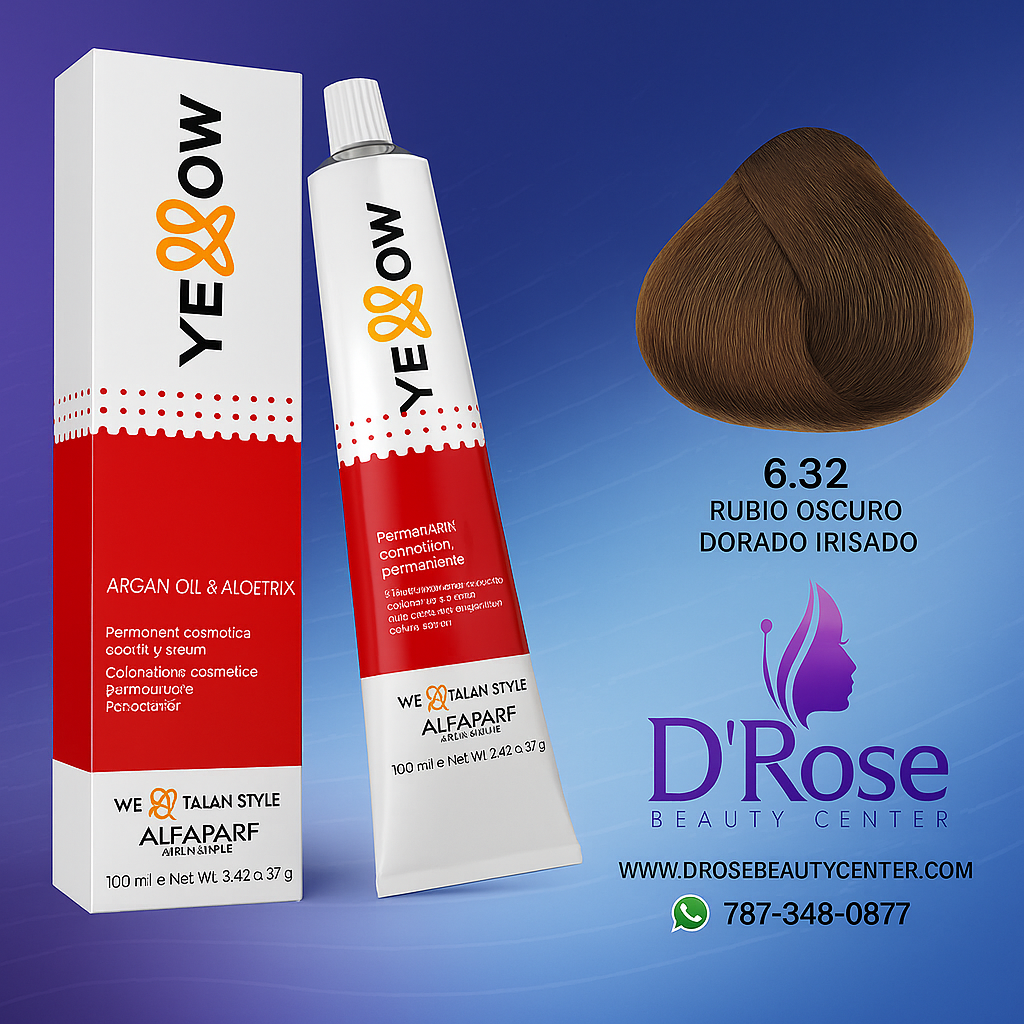 El Yellow Tinte 6.32 Rubio Oscuro Dorado Irisado es una coloración permanente profesional de alto rendimiento que aporta un rubio oscuro sofisticado y luminoso, con reflejos que combinan la calidez del dorado y la elegancia del irisado. Su fórmula enriquecida con Aceite de Argán y Aloetrix protege y nutre la fibra capilar, mientras el efecto bonding fortalece el cabello, logrando un color vibrante, uniforme y duradero.