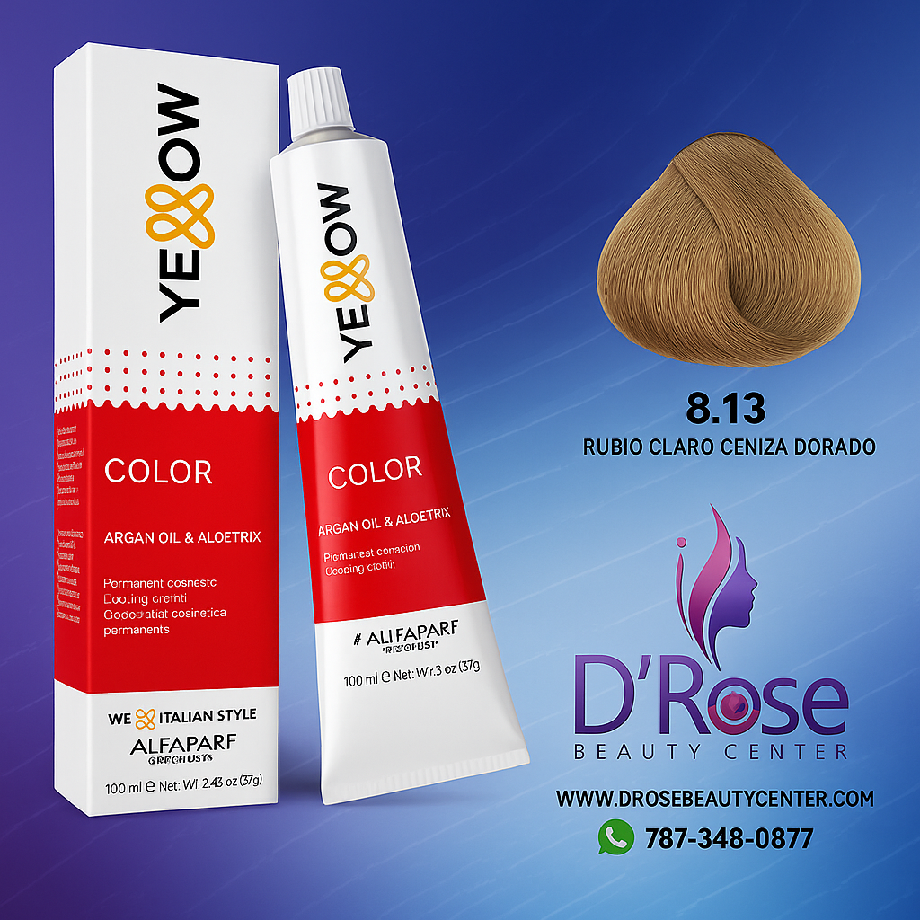 El Yellow Tinte 8.13 Rubio Claro Ceniza Dorado es una coloración permanente de alto rendimiento que combina reflejos ceniza y dorados para lograr un rubio luminoso, natural y equilibrado. Gracias a su fórmula enriquecida con Aceite de Argán y Aloetrix, protege y nutre la fibra capilar mientras asegura una cobertura uniforme, brillante y duradera. Su tecnología con efecto bonding fortalece el cabello y lo mantiene saludable durante todo el proceso.